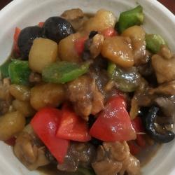2. Soak the dried mushrooms, wash them and cut them in half Open, cut green and red pepper into cubes, slice onions, ginger and garlic