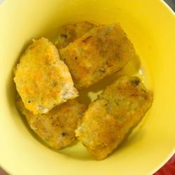 8. Dip some water on your hands before kneading, then knead the mixed meat paste into small cubes, wrap it in egg liquid and then a layer of bread crumbs