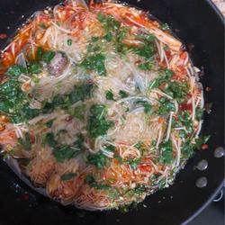 7.Add appropriate amount of water, add salt and other seasonings, and add enoki mushrooms