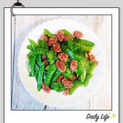 8.The delicious sausage and fried snow peas are ready.