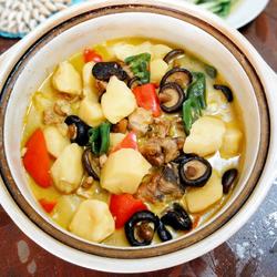 1.Chop the chicken legs into boiling water, soak the mushrooms, and cut the potatoes into cubes