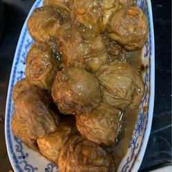 5.Poke a small hole in the oily gluten and stuff it with meat.I like the wrinkled skin of the gluten skin to be burned, so I stuff it with less meat (but not too much).Less)