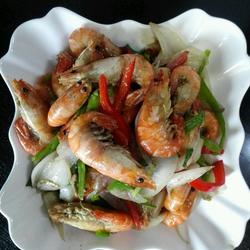 6. Stir-fry onions, green peppers until 5 mature, add the popped shrimps, and continue to stir Stir-fry, and finally add chicken essence, salt, and salt and pepper powder.