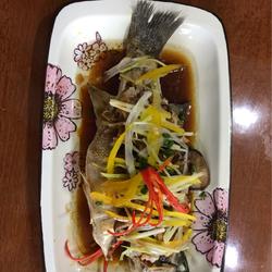 6. After the fish is steamed, take it out of the pot and put it on a plate.Wine, some shredded onions and colored peppers