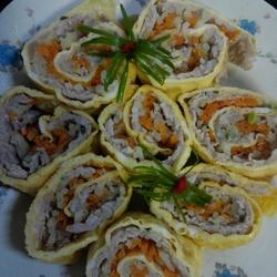 4. Then lay out shredded potatoes and carrots in turn, roll it up into an egg roll, Place in a plate and steam in a steamer (30 minutes)