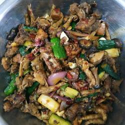 11. Heat the oil in the pot, add the dried chili pepper, Sichuan peppercorns, and dry pot sauce Put it into the pot and stir-fry over low heat until fragrant.Add the garlic and green onions and stir-fry for 1 minute.Add the pork ribs and stir-fry until the color changes.Then add the chicken feet and stir-fry until the color changes.Then add the onions and cucumbers in turn.Stir-fry the mushrooms constantly (avoid the pot), add an appropriate amount of salt, I added two tablespoons of salt.Then add an appropriate amount of chicken essence and stir-fry continuously.Add cumin powder at the end of the pot.