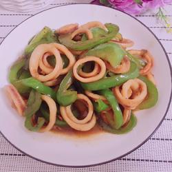4.Add the squid rings and stir-fry until they change colour, add cooking wine and light soy sauce and stir well