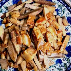 7. Add the fried pork belly and stir-fry for one minute.After the juice is reduced, remove from the pan.