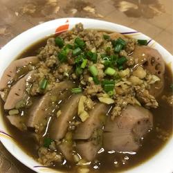 6. Heat the oil in the pot , add garlic and seasoned minced meat, then add half a bowl of lotus root soup, boil with thickened water and pour in the lotus root