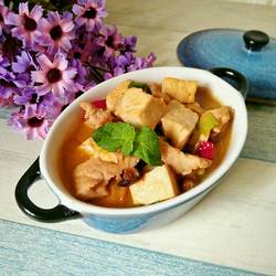 2.The tofu is soaked in salt water and cut into pieces in advance, and the pork is marinated with seasonings
