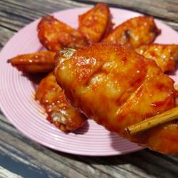 4. Take the refrigerated and delicious chicken wings out of the refrigerator.Place it on the grill and brush it with honey (the thickness of the brush is determined according to personal taste.It is not recommended to dilute the honey, as it will lack flavor after dilution).I brought babies about three years old to this friend's party, so I used a spoon to drip honey on it.Yes, with such a thick layer of honey, the chicken wings are juicy inside, and the outside has both the flavor of Orleans and the sweetness of honey.Children especially like it.If adults eat it, or people who don't like the taste of honey, you can smear the remaining sauce in the box a few more times to keep the chicken wings tender and delicious.
