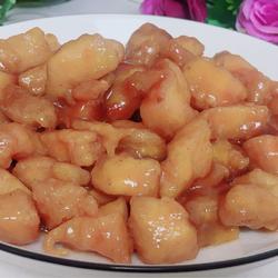 5. Remove from the pot and pour in Bring the prepared sweet and sour sauce to a boil, add the fried chicken tenderloin and stir-fry for a while