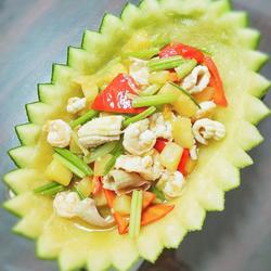 1. Hollow out the inner flesh of half a cantaloupe, scoop out the pulp (reserve), and use tools to shape it into a boat shape,