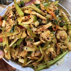 3.Put a little oil into the pot and add Heat the red pepper, add less celery, onion, green and red pepper and stir-fry, turn off the heat.Then add the cooked shredded chicken, add a little salt, sugar, pepper oil according to personal taste, add coriander and green onions, mix well and serve on a plate