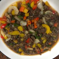 Beef brisket ( a pound ) | Green peppers, red peppers, yellow peppers, onions ( appropriate amount ) |