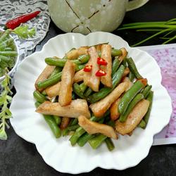 7. Add the green beans and stir-fry together, add a spoonful of salt to taste.
