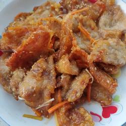 23. Add the fried tenderloin, shredded onions, garlic slices, ginger shreds, carrot shreds, and pour in the filled white vinegar sauce.Stir fry over high heat! Just brown the fried tenderloin! Take it out of the pan, put it on a plate and sprinkle with sesame seeds!