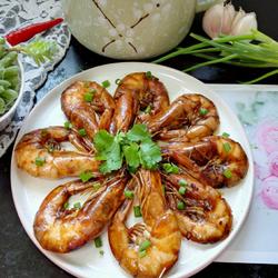 10.Place the shrimp evenly Sprinkle some chopped green onion on the plate and garnish with coriander in the middle.Take a picture of the finished product to complete a delicious braised prawn dish.