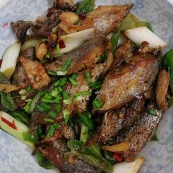 3.After the fish is fried, add onions, ginger, garlic, chili peppers, cooking wine, light soy sauce, and salt, stir-fry a little and take it out of the pan