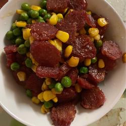 3. Stir-fry the sausage over low heat and add the corn Cowpeas, salt, MSG, June fresh, sugar, stir-fry for a while