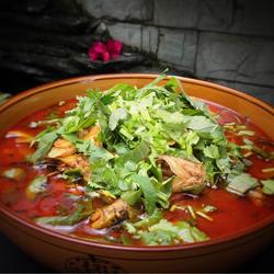 19.Pour the soup and water into a large basin and sprinkle with perilla leaves Just add cilantro.