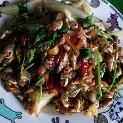 4.Put oil in the pot, stir-fry onion, ginger and garlic until fragrant, add sea screws, stir-fry over high heat, add oil and seafood soy sauce , spicy oil, salt, Sichuan peppercorns, when ready to serve, add coriander and onions, stir-fry and serve