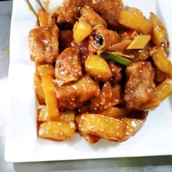 4. Heat oil in a pan, add scallions, ginger slices, onions, and minced garlic, sauté until fragrant, add pork ribs and stir-fry for a few times, add one or two spoons of water to simmer, add cooking wine and stir-fry for a few times, then add salt, sugar, MSG, Oyster sauce, light soy sauce, a little dark soy sauce, a little soy sauce, a little white vinegar, and sweet and sour sauce.Stir-fry for a few times.Add potatoes and stir-fry for a few times.Add a little cornstarch water to thicken and serve.