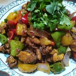 9.Add the cooked chicken, add sugar color, soy sauce, and stir-fry until fragrant.