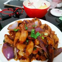4. Heat the pot, add a little oil, add some onions and fry until fragrant, then pour Add the marinated pork to the pan and stir-fry until almost cooked.