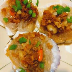 7. Fried minced garlic: Add minced garlic in warm oil, stir-fry until fragrant, add a small amount Add salt, steamed fish soy sauce, oyster sauce, and chicken essence.Stir-fry briefly and pour it on top of the scallops with a small spoon.