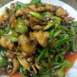 7. Add the beauty pepper and stir-fry.Add the garlic knots, add some salt, chicken essence, MSG and white sugar to taste and serve.