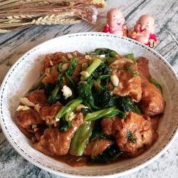 1. Wash the spinach, add a little salt, blanch it in water for 2 minutes, remove it and cut it into sections.Sauté minced onion and garlic in oil pan until fragrant, add spinach and stir-fry.(Blanch the gluten, dry it and tear it into pieces by hand for later use)