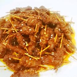 6. When the oil is hot and smokey, add toothpick beef and fry until golden brown