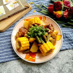 7. Then pour in the potatoes, beans and corn that have been processed in advance and stir-fry evenly.