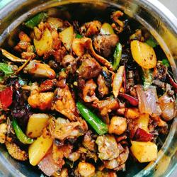 9.Saute until fragrant, pour in the chicken and stir-fry