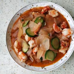4. Heat the oil in the pan and sauté until fragrant.Add the radish and stir-fry.Add the very fresh flavor and salt, then add an appropriate amount of water and cook until the pot boils.Then add the shrimp segments and cucumber and stir-fry.Just boil the pot evenly