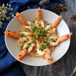 8. Place the shrimp on the vermicelli, and then add the fried garlic.Pour the juice over the shrimp and vermicelli.