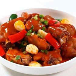 2. Burn oil in the pot and slide the pot , add ginger slices and star anise and stir-fry until fragrant, then add pig's trotters and stir-fry over low heat until the pig's trotters turn slightly white, add Sichuan peppercorns and diced dried chilies and continue to stir-fry.Stir-fry until the pig's trotters turn slightly yellow, add an appropriate amount of oyster sauce and soy sauce, stir-fry evenly, add an appropriate amount of water and add dark soy sauce to adjust the color