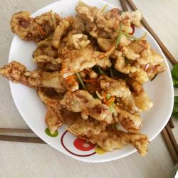 3.Put oil into the pot and heat until seven When hot, add the battered meat slices and fry until golden brown and take out.