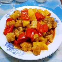 6. Leave a small amount of oil at the bottom of the pot, add minced garlic and ginger and stir-fry until fragrant.Add the prepared sauce and stir-fry for 30 seconds.Add pineapple meat and red bell pepper and simmer for 3 minutes.Add the fried pork and chicken essence and continue to simmer for 2 minutes