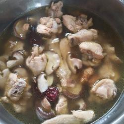 2.Wash and cut the mushrooms, put them into the pressure cooker, add the washed chicken wings into the pot, 3 red dates, 10 wolfberries, ginger, and appropriate amount of salt