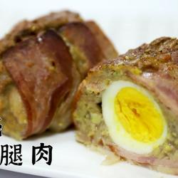 6.The marinated chicken legs are placed on the chicken puree, and the cooked eggs are stuffed into the chicken legs
