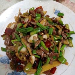 5. Pour in the fried beef and stir-fry together, add a little salt, and finally Add the garlic sprouts and stir-fry for a while