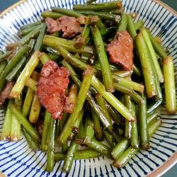 1. Wash and cut the garlic into sections, the head and tail parts are relatively old Don't discard it, slice or shred the pork, mine is flaky, you can buy a slightly fatter one that will be more fragrant if you can eat fat meat.