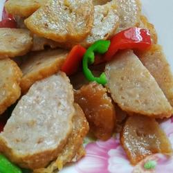 1.Preparation materials: meat rolls, green and red peppers, garlic