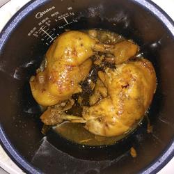 3.Put oil in the rice cooker, then add chopped green onion and ginger slices, and cook 2 chicken legs, put the sauce you just prepared! Two spoons of Coke! Set the rice cooker to firewood rice! Once one side turns golden brown, flip over! Waterless chicken legs are ready!