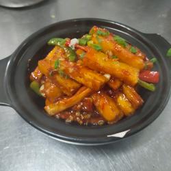 7.Put about 5 grams of base oil in the pot, add 20 grams of minced garlic, and 5 grams of chopped green onion.Stir-fry until fragrant.Add 25 grams of pickled pepper paste and stir-fry over low heat until the red oil appears., add 65 grams of vinegar and 45 grams of white sugar, add 2 grams of water starch to thicken the sauce, add fried eggplant, green and red pepper strips, stir-fry evenly and remove from the pan,