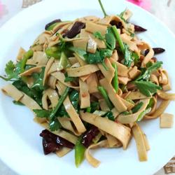6.Add the dried tofu skin and stir-fry, then add salt