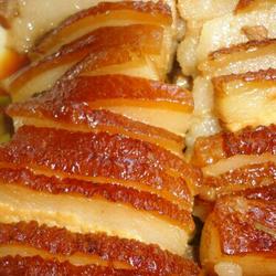 2. While the pork belly is hot, apply dark soy sauce on the skin and let it dry for a while
