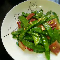 3. Put oil in the pan and fry the bacon first, add snow peas, minced garlic, minced ginger, Stir-fry salt and oyster sauce over high heat, pour in water and starch and serve.